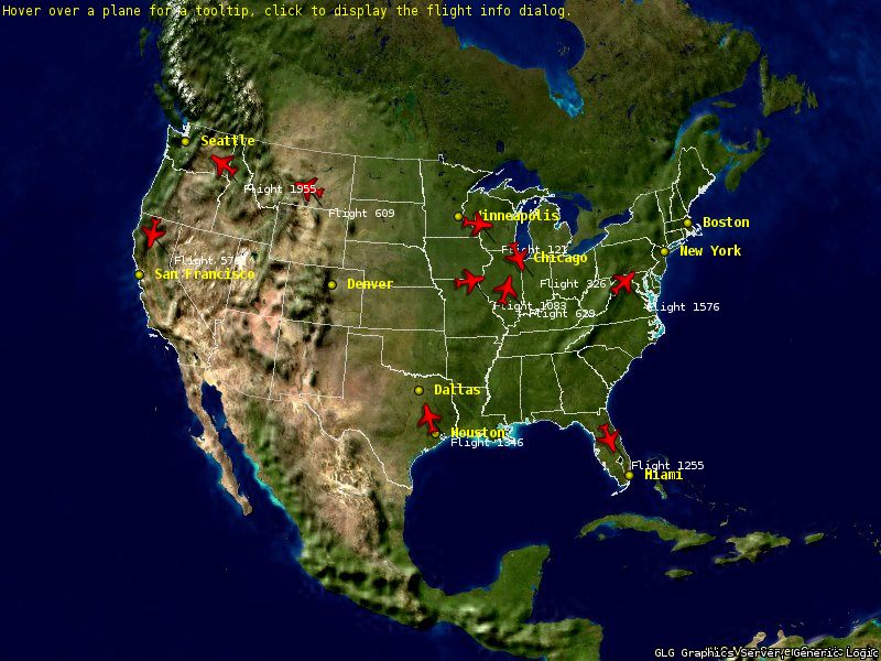 The GLG Map Server is used to generate the background map image for the selected region using the selected GIS layers. The GLG GISObject manages dynamic icons in the GIS coordinate system and allows the application to position icons by specifying their lat/lon coordinates. A vast collection of graphs, meters and dials , avionics gauges and process control widgets are provided in addition to the custom graphics.