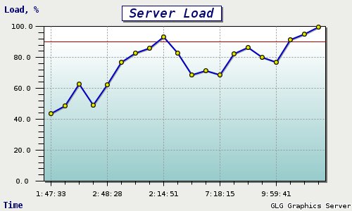 The graph image of the requested size is generated on the server side using the GLG Graphics Server in the form of a JSP Servlet or an ASP.NET Handler. The size of the graph image is specified using the width and height parameters of the URL. Click here to display the graph's URL directly to see its parameters.The graph Servlet or Handler used by the demo is written in a generic way and may be used to display various types of graphs by using the graph_type URL parameter. The same image URL may be used as a component in multiple web pages. For example, the AJAX Dashboard Demo uses the URL to render an instance of this graph in a larger dashboard. JSP Servlet and ASP.NET Handler source code is provided and may be further customized if required.