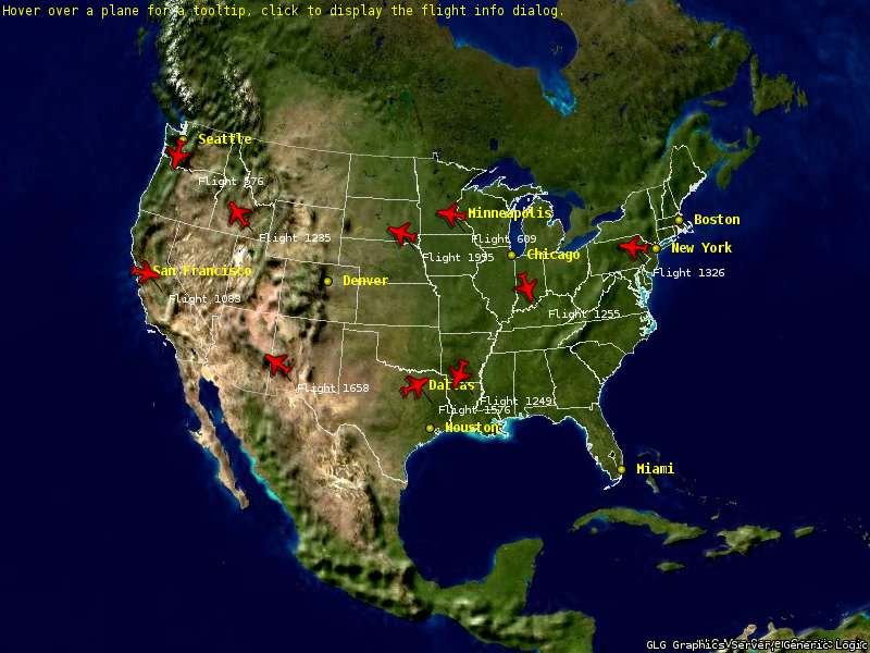 The GLG Map Server is used to generate the background map image for the selected region using the selected GIS layers. The GLG GISObject manages dynamic icons in the GIS coordinate system and allows the application to position icons by specifying their lat/lon coordinates. A vast collection of graphs, meters and dials , avionics gauges and process control widgets are provided in addition to the custom graphics.